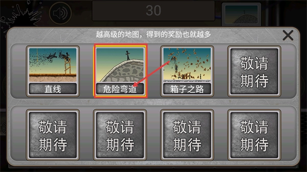 选择【危险弯道】地图,这个地图等级越高奖励就越丰厚,开启火柴人驾驶挑战就能获取丰厚奖励。