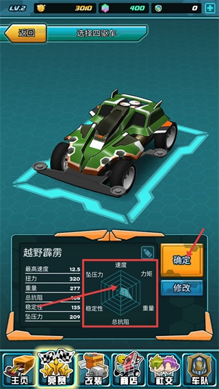 挑选【越野霹雳】这款四驱车,查看它的【速度】【坠压力】等性能参数后,点击【确定】按钮,以此完成四驱车竞赛的车辆配置准备工作。