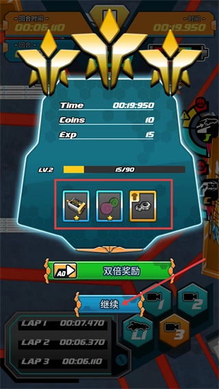 竞赛结束后可领取【电池】【齿轮】等奖励,点击【继续】就能进入下一场景,这些资源可用于车辆升级或后续竞赛的积累。