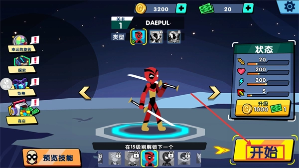 点击“开始”按钮进入关卡后,你可以查看角色的各项状态,比如攻击、血量、能量、暴击等属性。你可以消耗金币或者钞票来升级这些属性,从而提升角色的战斗力,以便更好地应对接下来的挑战。