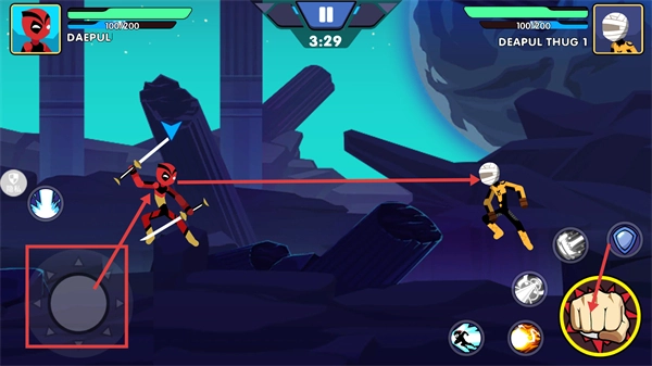 你可以通过左侧的虚拟摇杆来操控角色的移动方向,点击右侧的攻击按钮就能向敌人发起攻击,另外还能点击技能按钮释放各种技能,与名为“DEAPULTHUG1”的敌人进行对战。