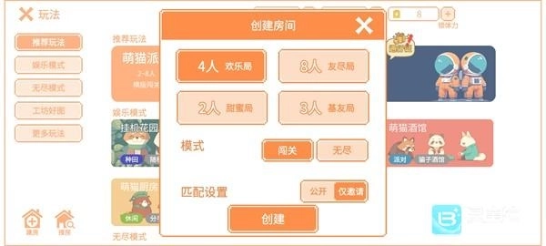 3、依据需求挑选房间可容纳的人数(比如2人的甜蜜局、4人的欢乐局这类),接着选定游戏模式(闯关模式或者无尽模式),与此同时把房间类型设置成「公开」或者「仅邀请」,确认所有设置无误后点击创建按钮。