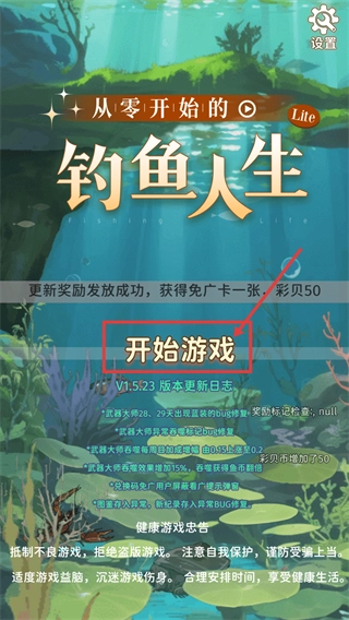 点击【开始游戏】进入【从零开始的钓鱼人生-Lite】,就能领取更新奖励【免广卡一张】和【彩贝50个】,解锁钓鱼玩法。