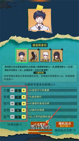 选定【平平无奇】身份后,会被分配【可用点数-5】,建议优先加【技巧】以提升基础钓鱼成功率,同时激活【八面玲珑】天赋来获取额外收益。
