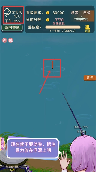 进入钓鱼界面后,按照提示关注【浮漂】,保持操作平稳,留意【当前分数-3720】和【晋级要求-30000】,逐步积累熟练度。