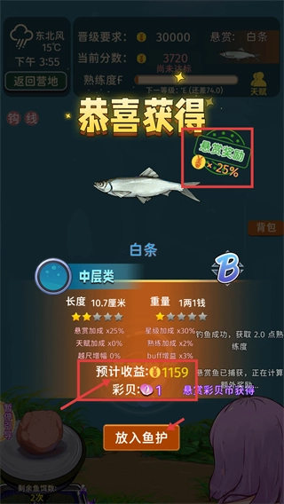 钓到【白条】后,点击【放入鱼护】可得到【预计收益-¥1159】和【彩贝-1】,利用【悬赏奖励-+25%】能提高收益效率。