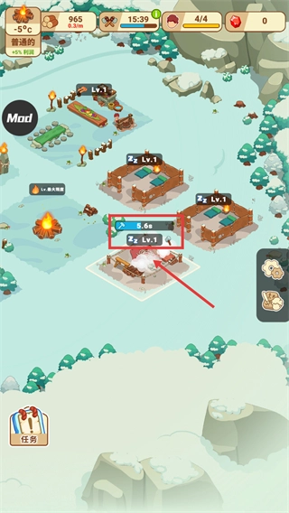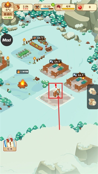 留意【-5℃】的环境情况,木材目前处于【2.0k-0.3/m】的状态,点击带有感叹号标识的建筑,推动【任务】进展,保持资源产出的节奏。
