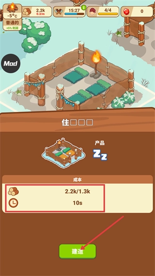 进入住所建造界面,消耗【木材-2.2k/1.3k】并等待【10s】,点击【建造】按钮,获取对应产品以提升居住能力。