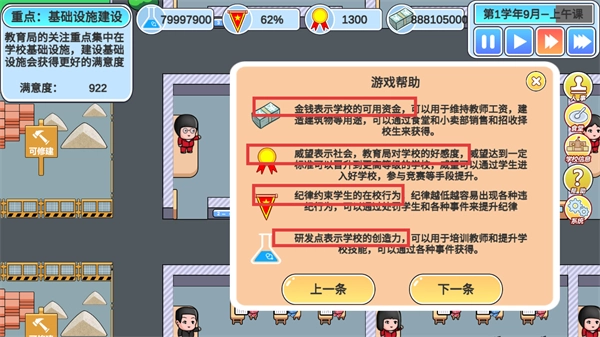 可以通过【游戏帮助】功能来熟悉各项核心资源的作用:其中【金钱】是保障学校日常运营的基础;【威望】是推动学校等级提升的关键;【纪律】则用于规范和约束学生的行为表现。