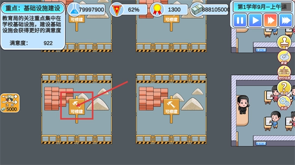 在【重点:基础设施建设】阶段,点击场景里带有【可修建】标识的区域,就能进入校园建设界面,通过推进各类设施的搭建工作来提高满意度。