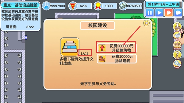 已建成的建筑(如图书室)可花费【200000元】进行升级,以此进一步强化其功能效果,提升校园设施的整体价值。