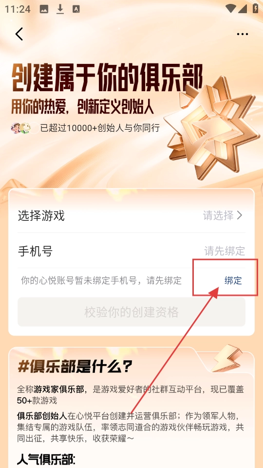 进入创建俱乐部的页面后,要是系统提示需要绑定手机号,那就点击【绑定】按钮,进入手机号绑定界面,以此为创建俱乐部做好准备。