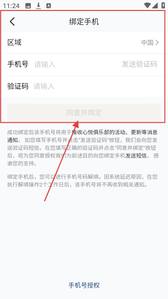 在手机号绑定页面,先选择对应区域,接着输入手机号码,随后获取并填写验证码,最后点击【同意并绑定】按钮,即可完成手机号绑定操作,进而继续进行俱乐部的创建流程。