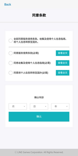 然后勾选同意全部条款,设定年龄后点击确认。