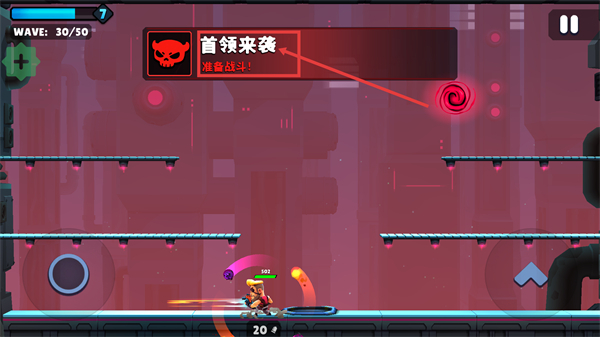 当游戏进度处于【WAVE:30/50】阶段时,系统将触发【首领来袭-准备战斗!】的提示信息。此时玩家需要借助瞄准按钮与移动按钮,提前为即将到来的首领战斗做好充分准备。