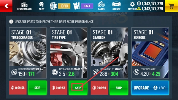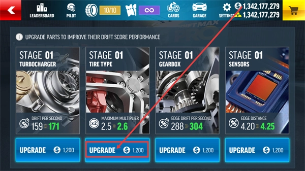 在升级界面选择【STAGE-01】类部件,点击对应的【UPGRADE】按钮,消耗1200金币来提升该部件的性能属性。