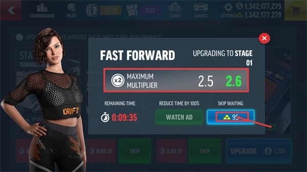 在【FAST-FORWARD】界面,花费95金币点击相应按钮,就能跳过等待时间,同时把【MAXIMUM-MULTIPLIER】提高到2.6。