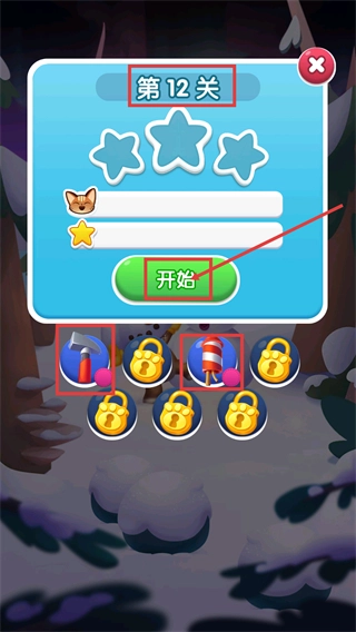 确认【第12关】的界面状态:已解锁的【锤子】【火箭】道具均可使用,点击【开始】按钮即可进入本关,接下来的目标是完成猫咪收集任务。