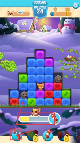 本关的目标是收集【0/3只猫】,目前还剩下【24次移动机会】。你可以通过积累道具进度条来使用道具,建议优先消除猫下方的方块以推进收集进度。