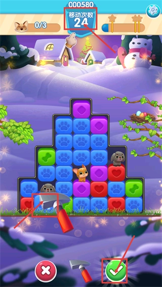 使用【锤子道具】消除指定方块后,点击【确认按钮】来使用该道具,再借助剩余的移动次数推动猫的收集进程。