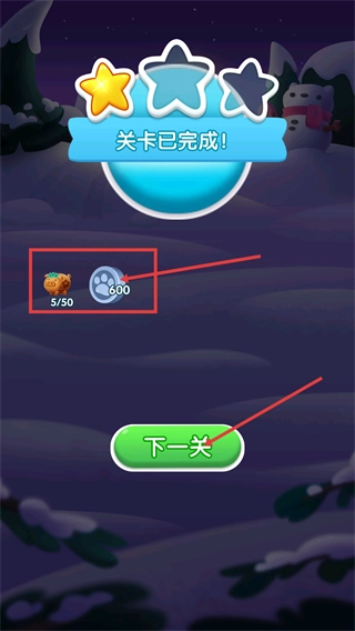 达成目标后会显示【关卡已完成!】的提示,同时可获得【5/50-道具】与【600-积分】,点击【下一关】按钮即可开启后续的挑战。