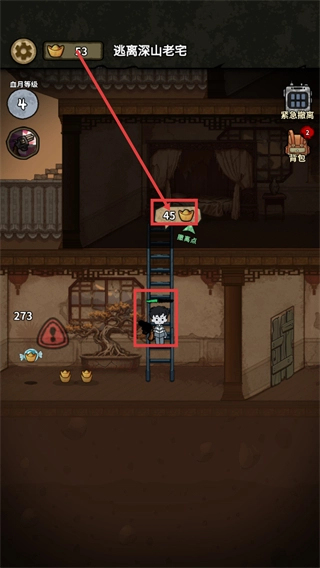 在场景里控制角色攀爬梯子,收集【45-金币】资源,注意【撤离点】的方位,以便为之后脱离危险做好准备。