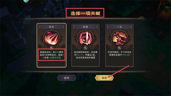 当你进入【选择一项天赋】的界面时,会看到有【连击】【抗袭】【一击】这几个选项可供挑选。选定你想要的天赋后,点击【领取】按钮,就能获得相应的天赋加成,从而增强自身的战斗能力。