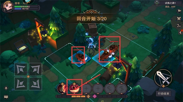 进入回合开始-3/20界面后,留意【状态-玛奇】的数值变化,通过下方技能栏进行操作,完成行动后点击【行动结束】按钮以推进流程。