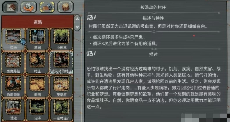 (3)、尸鬼和吸血鬼都属于高级怪,掉落不错,在村庄附近放置战场,在击杀怪物后生成鬼魂,最大限度的利用营火周围哨塔的存在,获得更多的经验、装备和卡牌。图书馆带着为了快速刷牌,同时也可以刷出书本怪物。墓园在村庄之间放置,因为我们打的怪的强度都比较高,所以3天一次的刷怪频率也够用了。