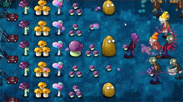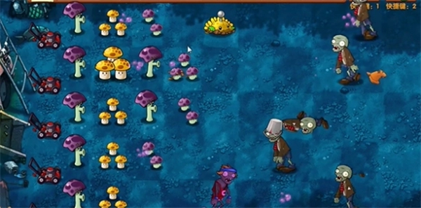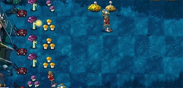 首先在左侧种上一列胆小菇和一列阳光菇,然后在第一条线路上放置两个土豆雷。