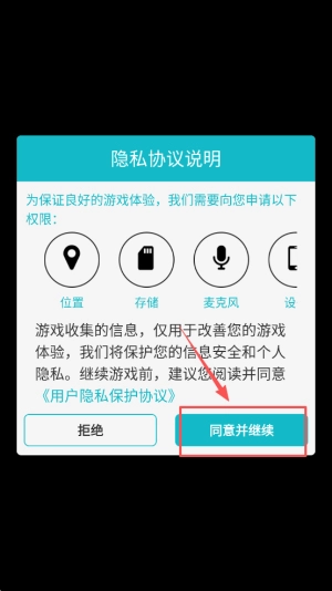 进入游戏的步骤如下:先打开游戏主界面,然后点击“同意并继续”按钮以接受隐私协议,这样就能进入主菜单了。