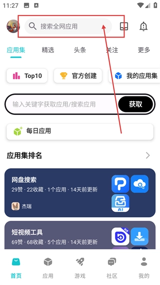 在平台首页点击顶部的【搜索全网应用】输入框,即可进入搜索界面,之后就能输入关键词查找应用了。