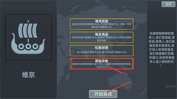 选择【维京】文明后,该文明的【原始宗教】特性能够降低农耕以及石器时代建筑的控制力消耗,点击【开始游戏】即可进入该文明的发展进程。