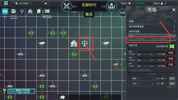 进入游戏后打开【市场】界面,提升市场等级能提高轮次售卖量和同时售卖量,完成批发订单可以获得资源收益。