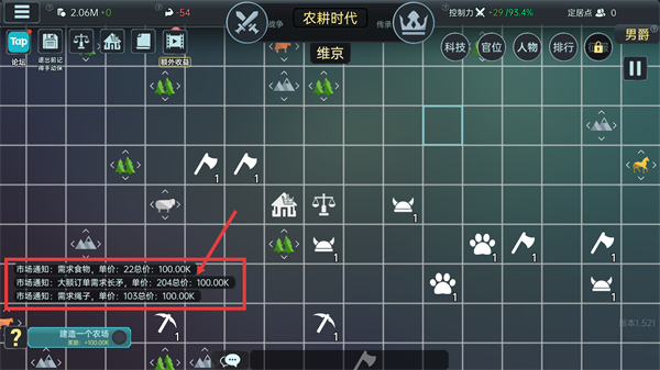 请留意【市场通知】里发布的资源需求信息,按照这些需求来生产相应的资源(比如食物、长矛等),完成对应的订单就能获取高额的总价回报。