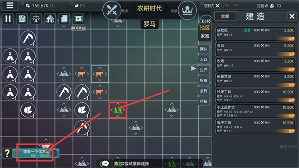 在罗马文明的农耕阶段,按照指引修建【伐木场】,投入相应资源完成建设后,能得到【120.00K】的奖励,并且该建筑会持续产出木头资源。