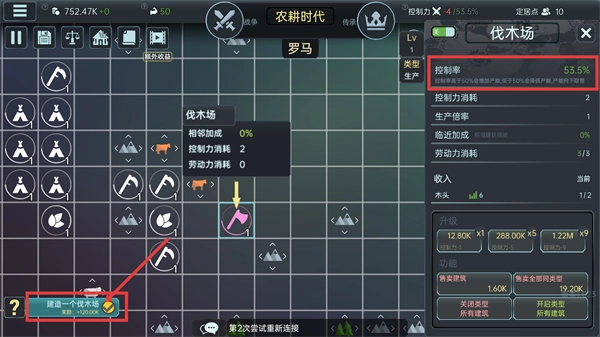 建造【伐木场】后,要留意它的【控制率】情况,当控制率超过50%时能提高产能,我们可以通过合理规划建筑布局来保持高控制率,从而提升生产效率。