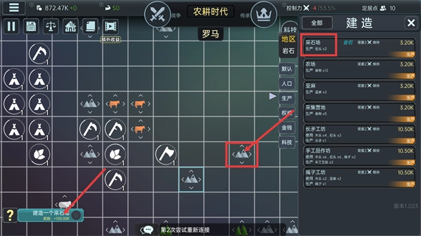完成伐木场的建造工作后,按照指引去建造【采石场】,需消耗相应资源并将其建在岩石区域,建造完成后能得到【150.00K】的奖励,同时采石场会开始生产石头资源。