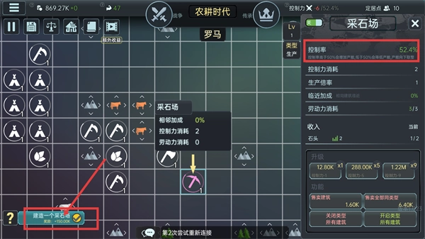 【采石场】的控制率也会对产能产生影响,要确保控制率维持在50%以上,另外还能借助升级建筑来进一步提高石头的生产收益以及建筑等级。