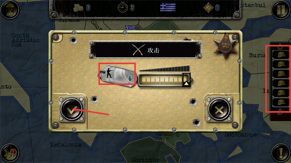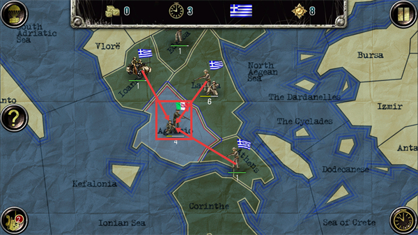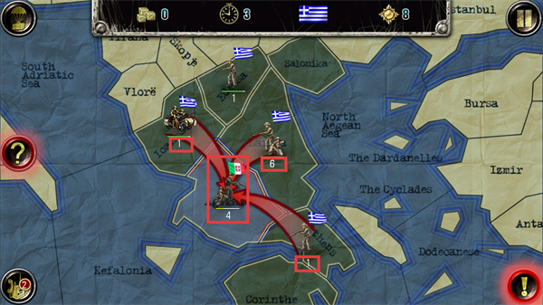 在希腊区域地图里,把周边的【1-己方单位】和【6-己方单位】整合起来,集中兵力围攻【Agrinion-4-敌方单位】,以此推进该区域的作战进度。