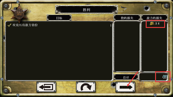 达成【攻克所有敌方省份】的胜利目标,敌方损失【4-头盔单位】,查看总计数据后点击前进按钮,推进后续的战役流程。