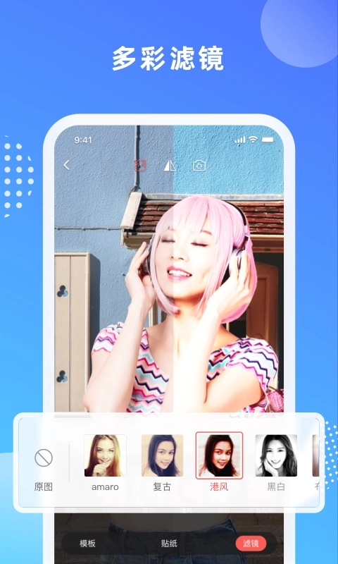 1、多种多样的滤镜,比如复古,港风,黑白,卡通、高光等