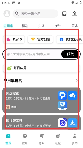 在首页的应用集板块里找到你要找的应用集(像【网盘搜索】这类),点击该应用集即可进入对应的应用列表页面。