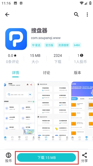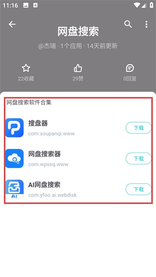 进入应用集页面后,你可以看到这个集合里包含的软件(例如【搜盘器】),点击对应的软件即可进入其详情页面。