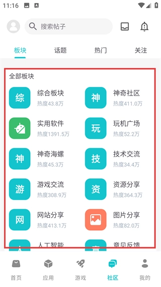 切换至社区页面后,你会看到【综合板块】【实用软件】等不同分类的板块,点击相应板块就能进入对应的交流区域啦。