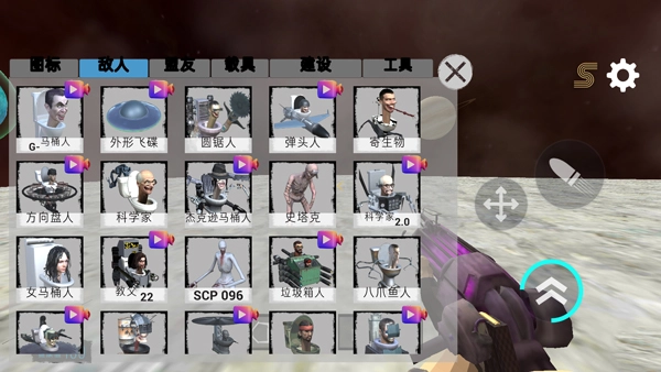 玩家点击左侧的箱子按钮后,就能挑选想要添加的敌人类型,像马桶人、圆锯人、弹头人、寄生物、外星飞碟之类的都可以选择。