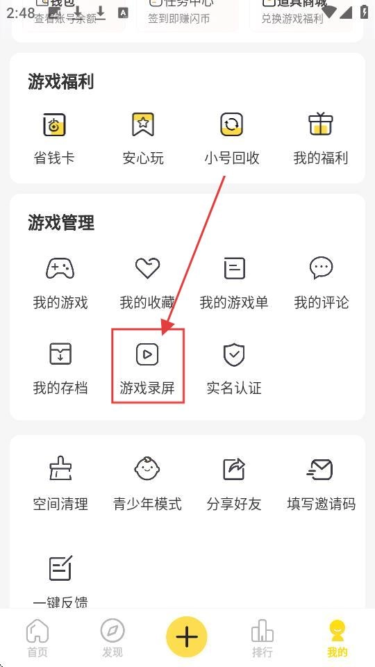 在个人中心页面,要是想录制游戏画面,点击【游戏录屏】按钮,即可进入游戏录屏页面。