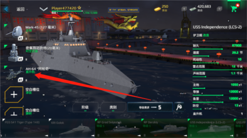 部分战舰的购买不仅需要消耗货币,还设有等级门槛,不过购买后能解锁更多武器和玩法。比如下图中的这款战舰,玩家入手后就能体验驾驶ah64阿帕奇战斗机参与战斗的乐趣。