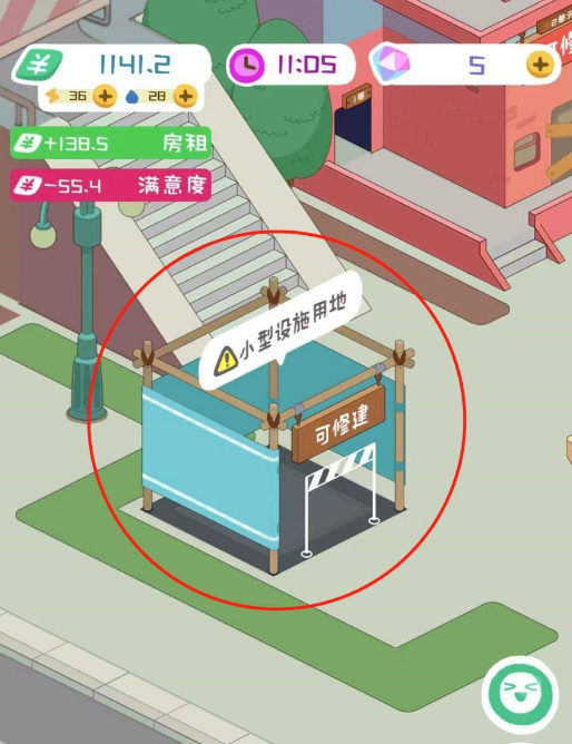 在房东模拟器里,找到标注着“可修建”的小型设施用地并点击它。