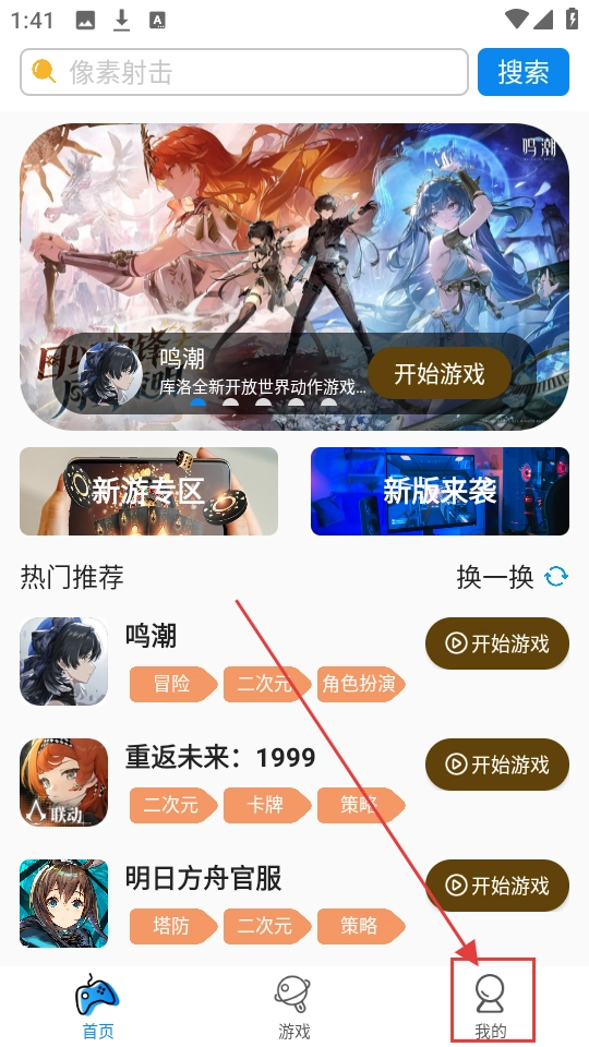 回到首页后,页面中间设有两个板块,分别是“新游专区”与“新版来袭”。